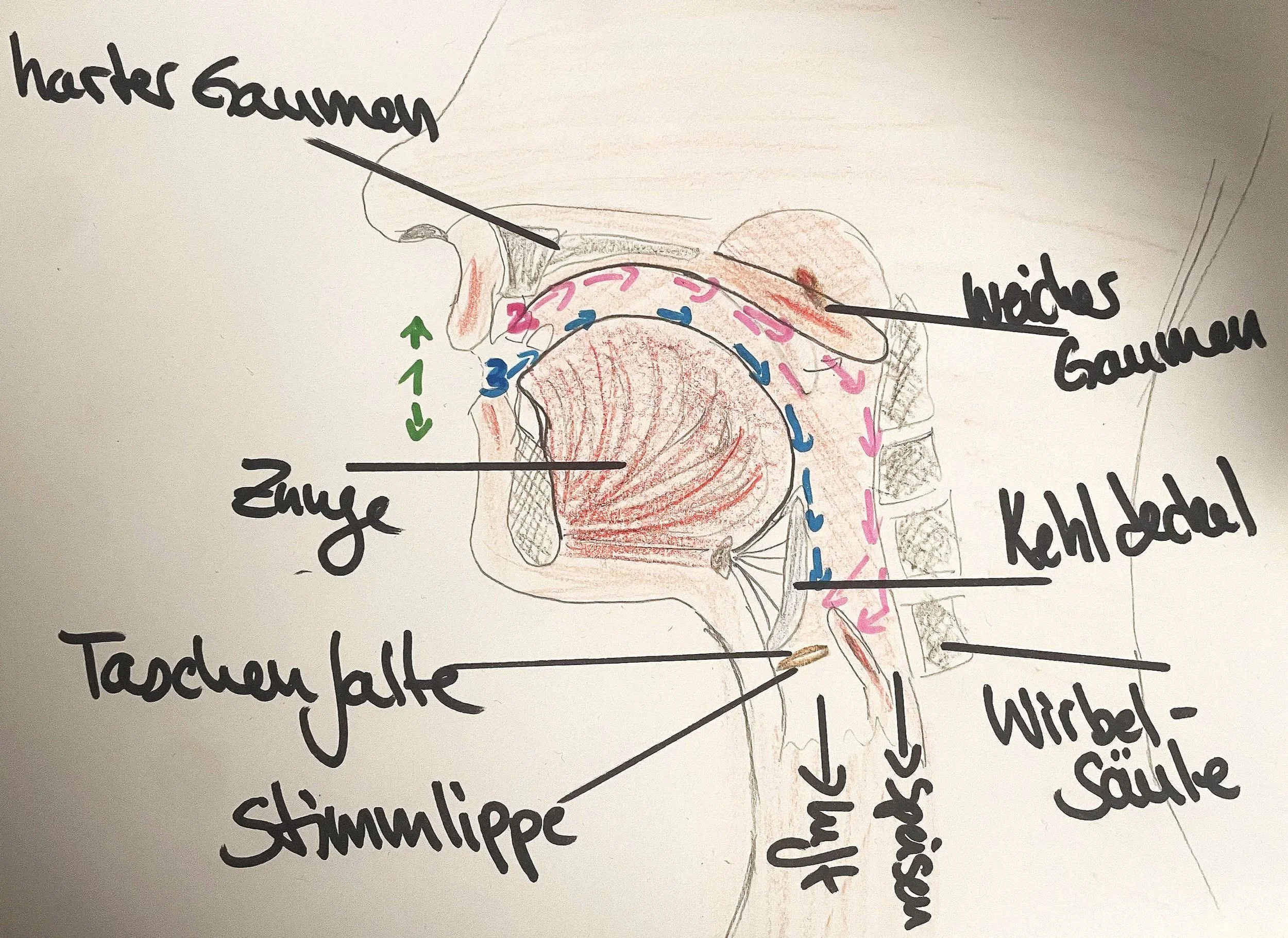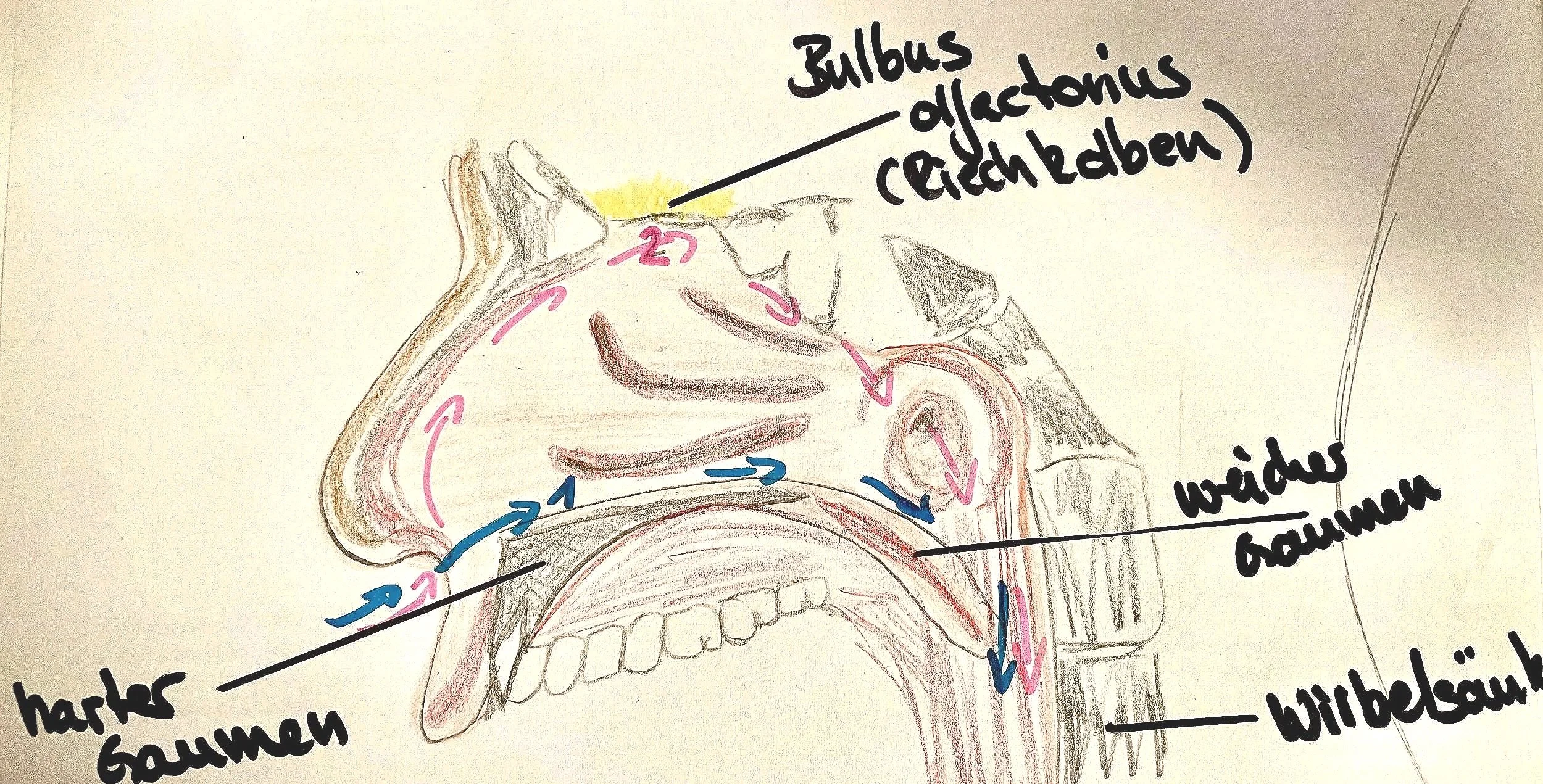 Was ich hier zu zeichnen versucht habe, ist außerdem, wie der weiche Gaumen hinten im Rachen den Mundraum vom Nasenraum trennt, indem er diesen verschließt. Die Luft kann dadurch nicht mehr in den Nasenraum einströmen. Der Weg, der übrig bleibt, führt über den Mund.